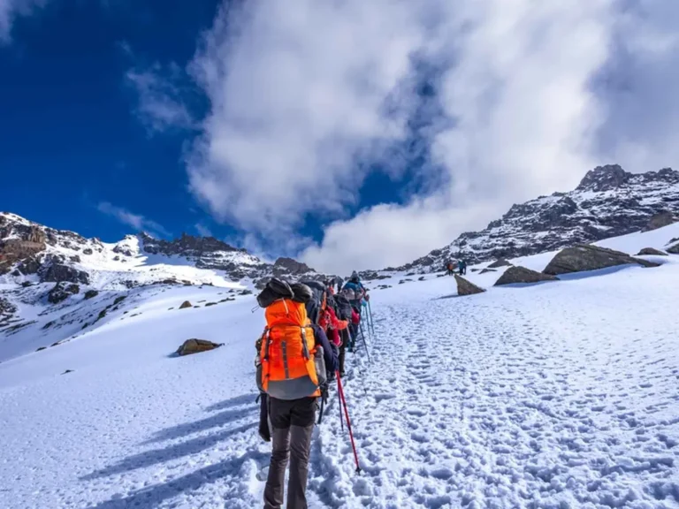 Day 6 is the climax of the Rupin Pass Trek and also the most challenging and rewarding. The trail takes you from Upper Waterfall Camp (13,120 ft) to Rupin Pass (15,250 ft) before descending to Ronti Gad (13,420 ft). The trek covers about 10–11 kilometers in 8–9 hours, demanding endurance, mental strength, and steady pacing. The day begins early, often before sunrise, to ensure a safe crossing of the pass. The initial stretch involves climbing steep snowfields and narrow ridges, with icy winds and dramatic landscapes marking your progress.