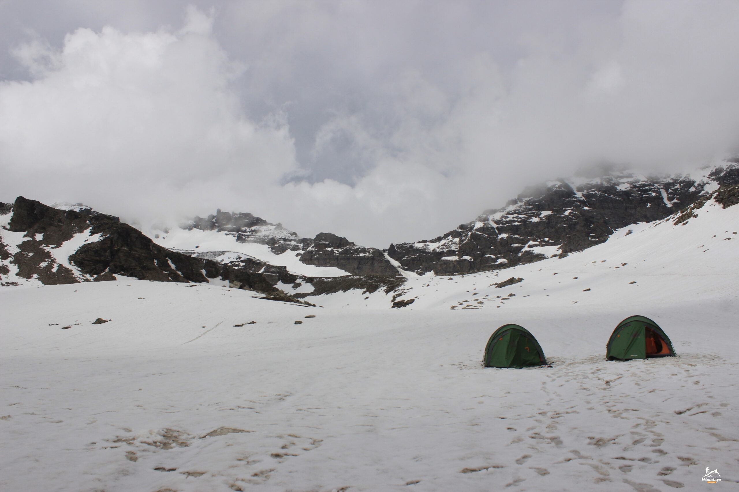 By early afternoon, you reach the Upper Waterfall Camp (13,120 ft), perched just above the waterfall and surrounded by snowfields and cliffs. This campsite is known for its breathtaking views, as the cascading water forms the backdrop on one side while towering mountains rise on the other. The environment here is raw and dramatic, with chilly winds and alpine terrain preparing you for the next day’s pass crossing. Spending the night here under the stars, with the roar of the waterfall echoing in the background, is an unforgettable experience of the Rupin Pass Trek.