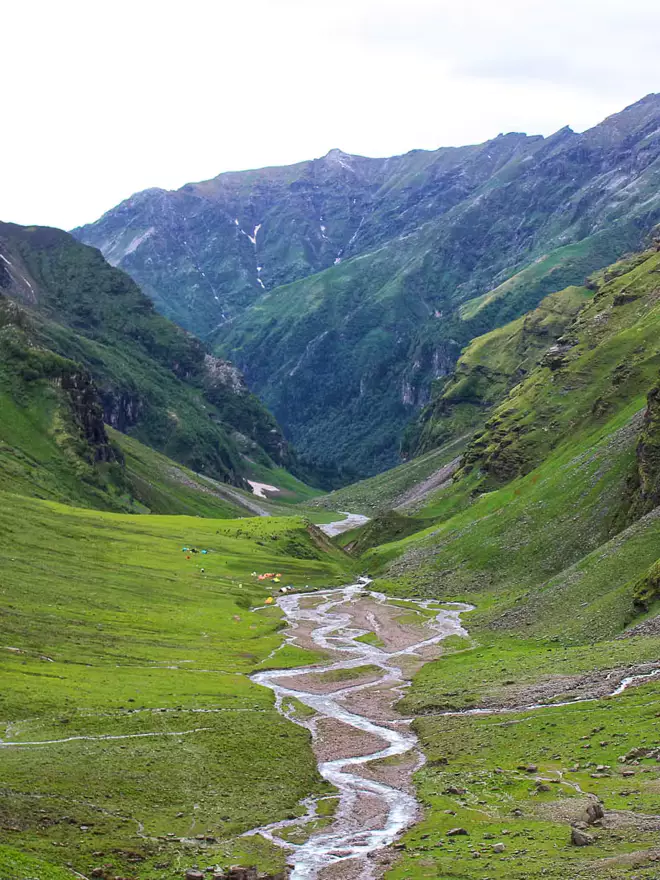 From the pass, a steep descent leads you towards Ronti Gad, passing through snow gullies and rocky slopes. The trail requires careful footing but gradually eases into alpine meadows dotted with wildflowers and grazing cattle. The campsite at Ronti Gad is a stunning high-altitude meadow with expansive views of the surrounding valleys and mountains. After the long and challenging day, resting here under a sky full of stars feels both peaceful and rewarding, marking the successful crossing of Rupin Pass