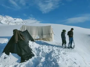 The most challenging and rewarding day of the Sar Pass Trek begins early in the morning from Nagaru. Trekkers start with a steady ascent through rocky trails, snow patches, and alpine meadows, gradually gaining altitude towards the Sar Pass at 4,140 meters. The climb is moderately difficult, requiring careful footing and pace management, but the spectacular panoramic views of snow-clad peaks, glaciers, and valleys make the effort worthwhile.